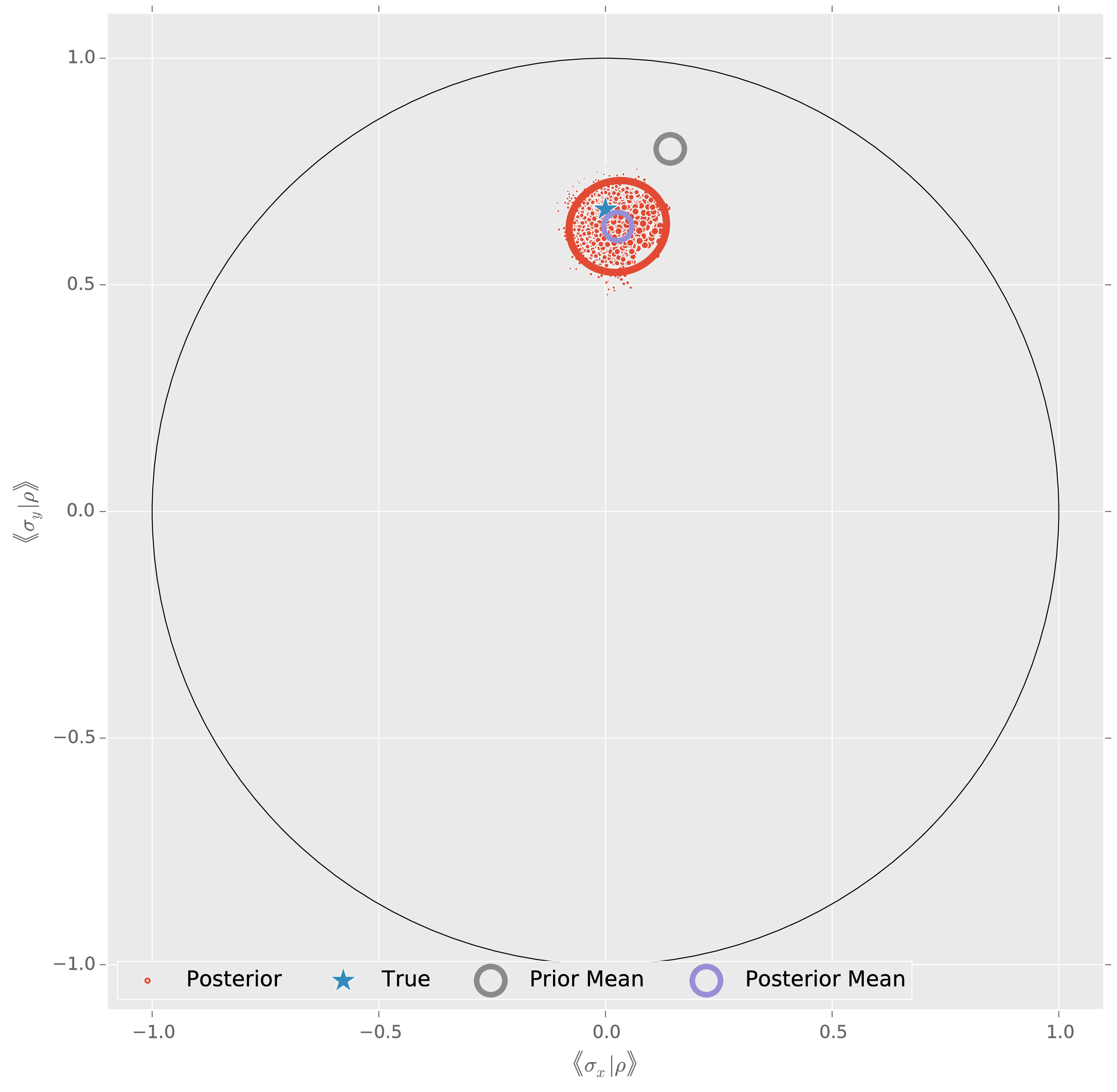 We estimate $\rho$ by the expectation value \[ \hat{\rho} = \expect[\rho | D] = \int \rho\,\Pr(\rho|E)\, \dd \rho. \]