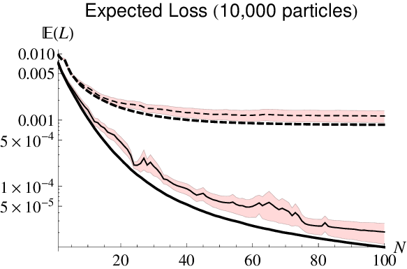 \begin{align} \Pr(\vec{x}) & = \sum_i w_i \delta(\vec{x} - \vec{x}_i) \\ w_i & \mapsto w_i \times \Pr(\text{data} | \vec{x}_i) / \mathcal{N} \end{align}Liu-West Resampling dynamically moves samples to recover numerical stability.