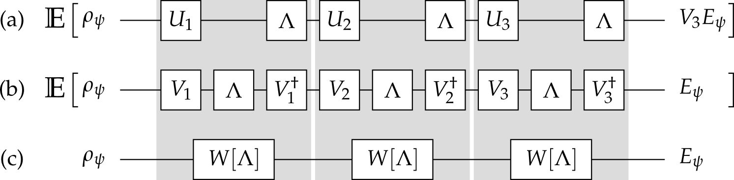 By choosing random sequences $\{U_1, U_2, \dots\}$, can implement twirling superchannel $W[\cdot]$ with imperfect gates.